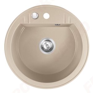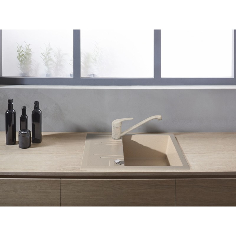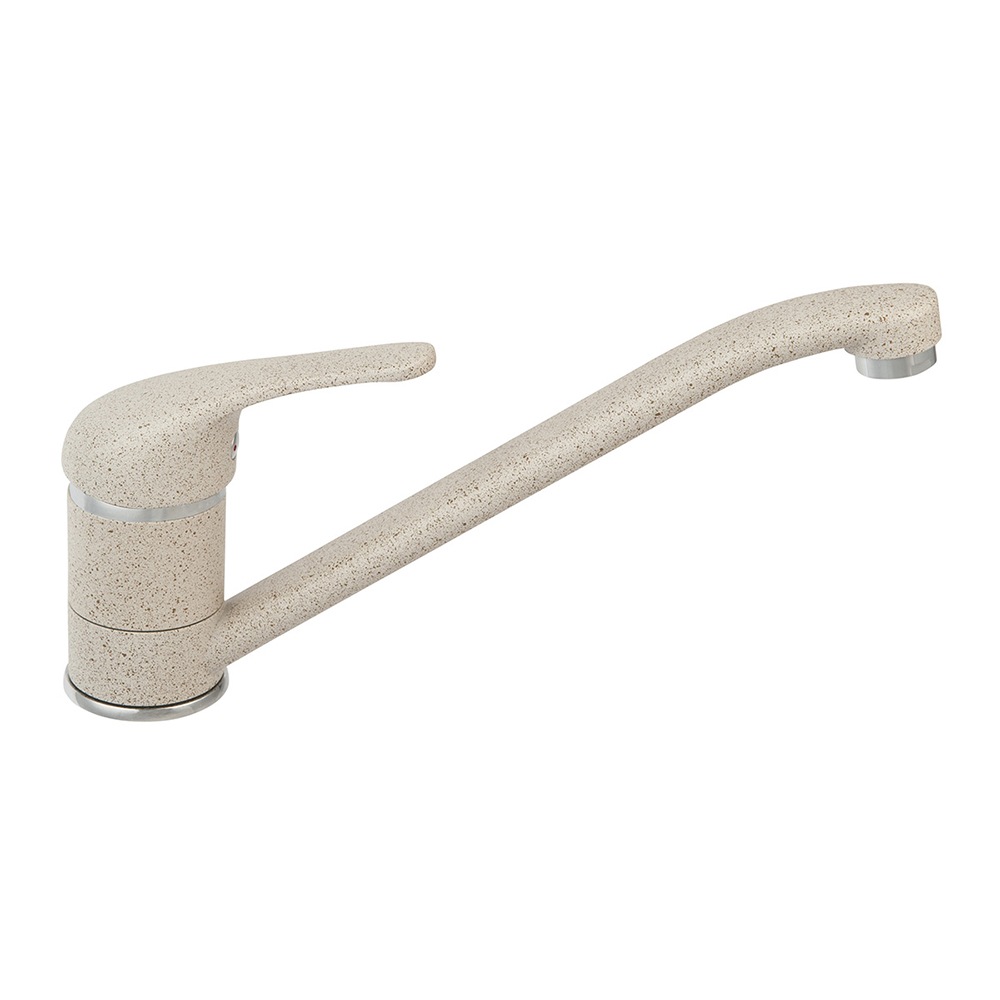 Baterija za sudoperu bež Ferro Freya BFR4S Jednoručna slavina za granitnu sudoperu, linija Freya. Keramički mešač 40 mm. Montira se na sudoperu. Perlator, regulator mlaza vode M22x1, brinox creva G 3/8 – M10x1 za priključak na vodu. Završna obrada u boji granitne sudopere , bež. Materijal – mesing.