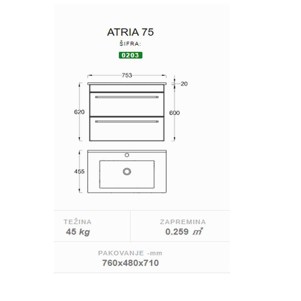 Kupatilski nameštaj ATRIA donji deo sa umivaonikom 75