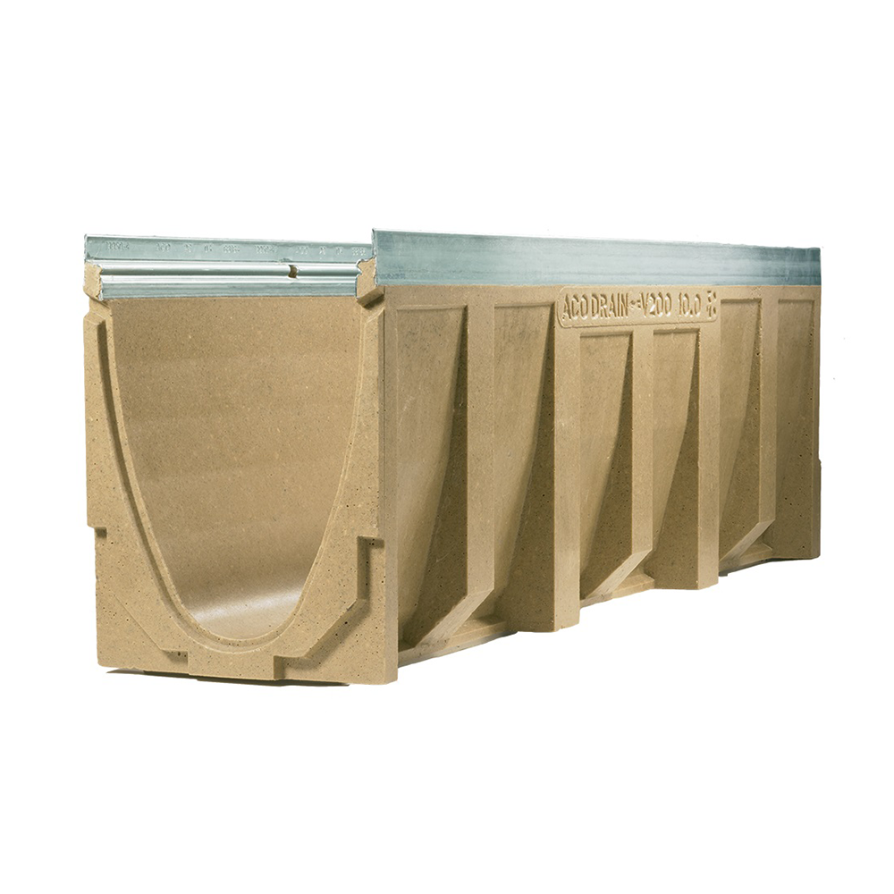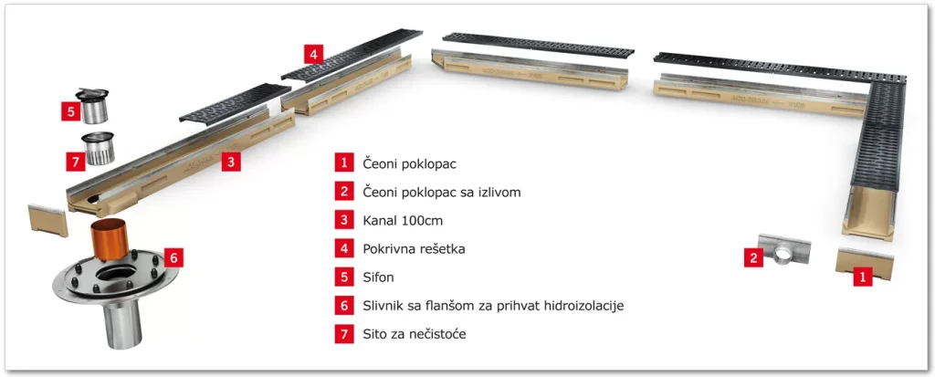 Sistem linijskih kanala za odvodnjavanje, proizvedenih od polimer betona, u skladu sa SRPS EN 1433, za klase opterećenja A15 – E600 KN, u širinama svetlog otvora 100, 150, 200, 300, 400 i 500 mm, sa zaštitnim rubom od pocinkovanog čelika, livenog gvožđa ili nerđajućeg čelika. Pet klasa opterećenja, šest svetlih širina, tri materijala zaštitnog ruba, predstavljaju prednost za široko polje primene.